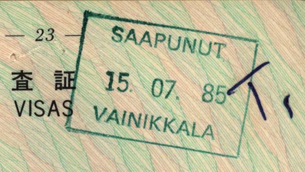 1985年7月15日早朝、ソ連を出国しフィンランドへ入国した。ソ連出国は別紙のビザとバウチャーを出国時に召し上げられてしまったのでパスポートにはソ連滞在の痕跡が残っていない。ソ連からフィンランドへ入国した記録は左の通りだ。