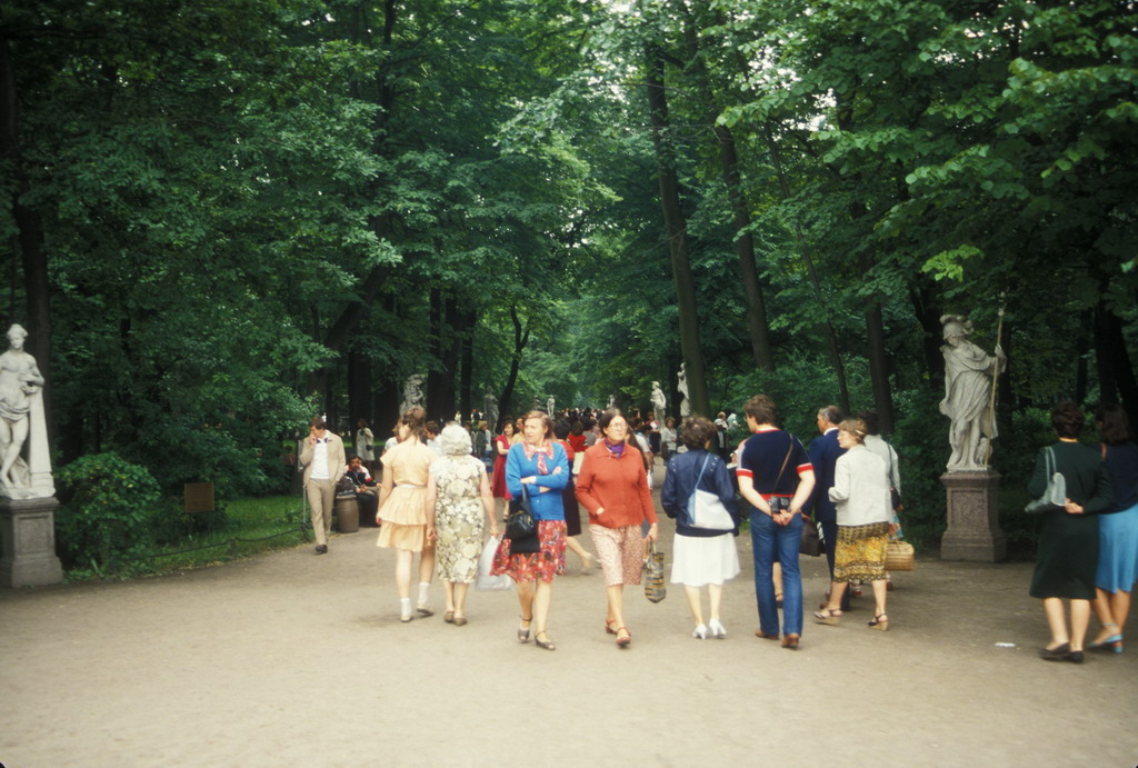 レニングラードへ着いた翌日、7月14日、郊外のペトロドヴォレツに宮殿があり足を伸ばした。フランス式の庭園はフィンランド湾へ向かってビスタが通っており、幾何学的な庭園のデザインは目を見張った。フランス式の典型なのだが。また、不定期に水が噴き出す噴水が小道に仕掛けられており、路面は濡れているのだがそれを知らないで通り過ぎようとすると急に水が噴出し観光客を楽しませていた。>>Petrodvolets