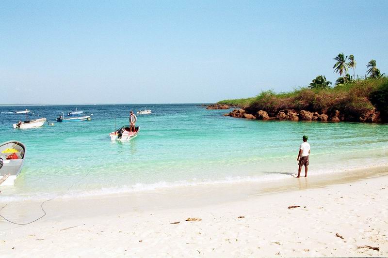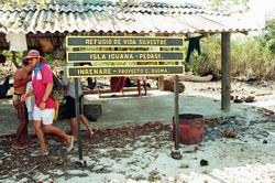 ペダシでギターの生演奏付き(自前)海鮮料理を楽しんだ翌日、小さな漁船をチャーターしてペダシ沖合いに浮かぶ野生生物保護区に指定されているイグアナ島を踏査した。町の外れ、やたら大きなマングローブに囲まれたクリークから3隻のボートに分乗する。静かにマングローブ林の中を走り出す。外洋へ出たとたんに波が高くなり、グラスファイバーの軽い船はひっくり返るのではと思うほど木の葉のようにうねりに左右された。 何度も何度もひっくり返りそうになりながら波に合わせて体重を前に移動することを繰り返しているうちにイグアナ島の島陰に入ることができた。持参したカメラが心配だったが、海水がかからないようにビニル袋に入れ、ディパックを舳先に近いところへ置いておいたので無事だった。 左の写真は、イグアナ島へ着いてから撮影したものであるが、服がぐちゃぐちゃになっている様子は海の荒れ具合を物語っている。このとき、先に出た我々のボートだけがイグアナ島に着き、他の2隻は一旦引き返し、その後、波が落ち着いてからそのうちの1隻が再度挑戦しやってきた。 ![]() |