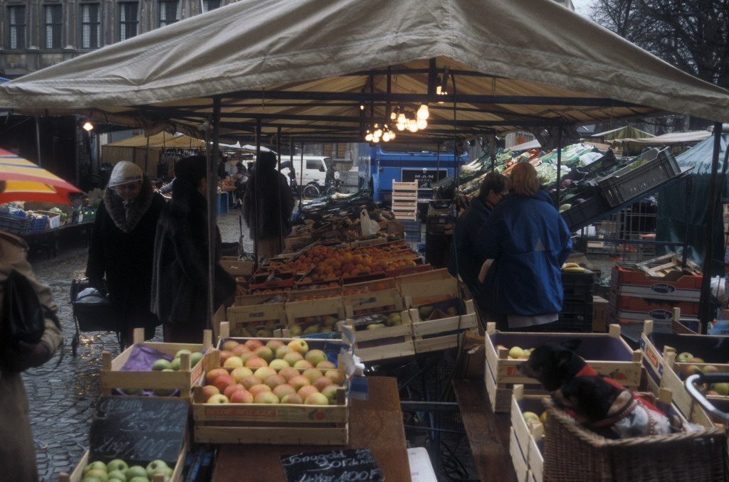 Markt 市の中心となる広場(グランプラス)。広場に面しているギルド・ホールとその上にそびえる鐘楼は13世紀に建設されたもので、その後拡張されています。鐘 楼は高さ83メートル。366段の階段を登る途中で、総重量27トンというカリヨン(47個の鐘)や、自動演奏装置を見ることができます。15分ごとに美 しい音色を響かせている。 広場の東側の建物は、西フランドル州庁舎。広場中心の銅像は14世紀のフランスの圧制下での市民蜂起の英雄ヤン・ブレーデルと ピーテル・デ・コーニング。