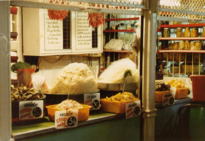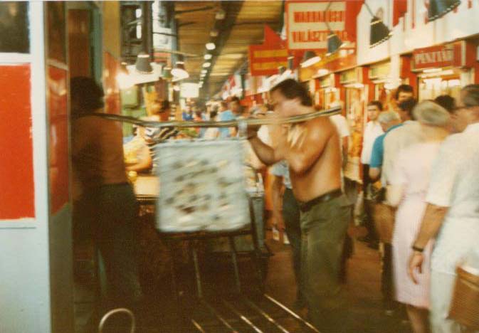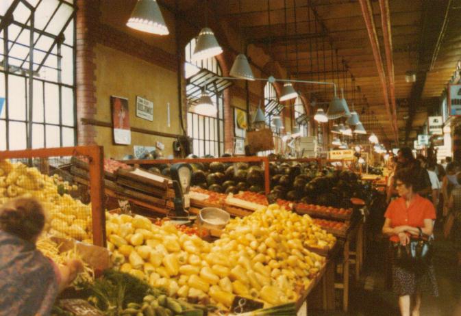 ペスト地区をぶらぶら街を歩いていたら市場を見つけた。それは中央市場だった。興味本位で中に入ってみたらすごい活気があり、またカラフルなパプリカ、夏の野菜や果物が山積みにされていた。あるコーナーでは酢漬けキャベツ、ドナウの魚(鯉)が並べられていた。途中、鯉を運んでいる光景に出くわした。筋骨隆々とした上半身裸の人が2人で鯉が入った入れ物を運んでいった。