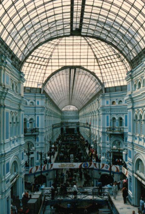 広場に佇み人の動きを見ていたら何人もの人がここに吸い込まれていく。その後を追いかけ好奇心いっぱいで扉を開けたらそこはアーケードだった。赤の広場に面するグム百貨店(Главный Универсальный Магазин)、天井がガラス張りで自然光がよくはいる2層アーケード様式の建物で小さなお店が限りなく繋がっていた。 一通り見て回ったが衣類や小間物、化粧品を扱う商店が多かった。中には家庭電化製品も販売されていたがソ連製か他の共産圏製だった。衣類なども共産圏の製品で西側のデパートで見かける物ははなかった。とにかく規模が大きくまた歴史的な建物であり印象的だった。