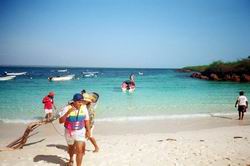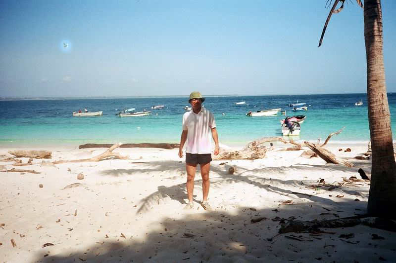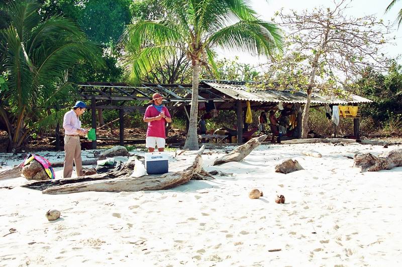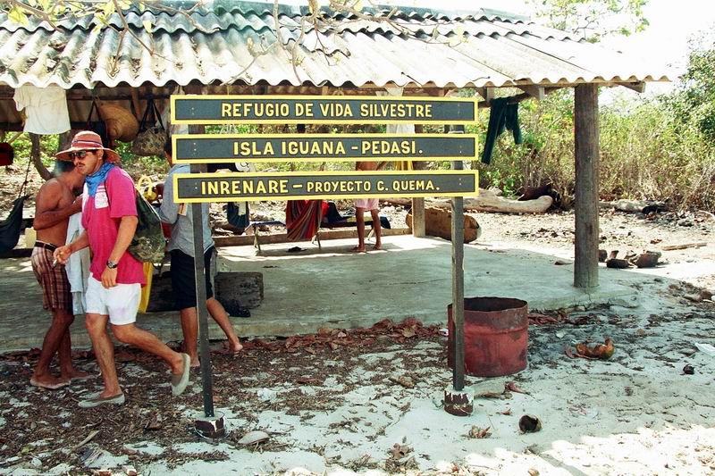 ペダシでギターの生演奏付き(自前)海鮮料理を楽しんだ翌日、小さな漁船をチャーターしてペダシ沖合いに浮かぶ野生生物保護区に指定されているイグアナ島を踏査した。町の外れ、やたら大きなマングローブに囲まれたクリークから3隻のボートに分乗する。静かにマングローブ林の中を走り出す。外洋へ出たとたんに波が高くなり、グラスファイバーの軽い船はひっくり返るのではと思うほど木の葉のようにうねりに左右された。 何度も何度もひっくり返りそうになりながら波に合わせて体重を前に移動することを繰り返しているうちにイグアナ島の島陰に入ることができた。持参したカメラが心配だったが、海水がかからないようにビニル袋に入れ、ディパックを舳先に近いところへ置いておいたので無事だった。 左の写真は、イグアナ島へ着いてから撮影したものであるが、服がぐちゃぐちゃになっている様子は海の荒れ具合を物語っている。このとき、先に出た我々のボートだけがイグアナ島に着き、他の2隻は一旦引き返し、その後、波が落ち着いてからそのうちの1隻が再度挑戦しやってきた。 ![]() |