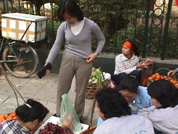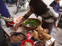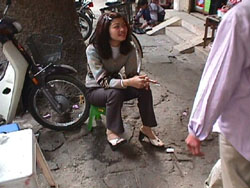 今日のお昼ははベトソバの”フォー”にしようと連れだって事務所から歩いて数分の食堂街へ行く。事務所を出たとこにはいつものように行商のおばさんたちが果物を並べている。 Feb.3, 2000 |