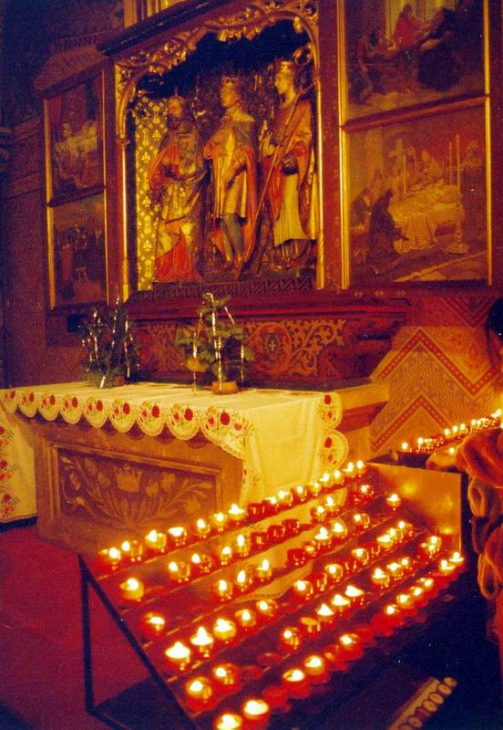 蝋燭の灯りが印象的だったマーチューシャ教会、外は雲に手が届きそうなほどどんよりとしていたが、教会の中は何本もの蝋燭の光が内部を照らしていた。