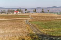 ブラショフからシギショアラへ向かう途中牧歌的な風景に出会った。思わず車を止めシャッターを押した。12月という季節柄農地は既に収穫が済んでいて寒々としていたが赤い屋根の農家とそこまで続く地形に沿った少しうねった細い道がとても印象的だった。 |