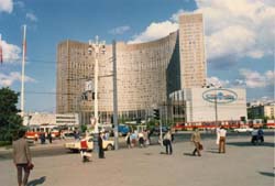 横浜を出航しナホトカ航路シベリア鉄道経由で旧ソ連邦の首都モスクワへ約10日間かけて辿り着いた。その長旅の疲れを癒すべくモスクワオリンピック開催直前に建設された真新しい(当時としては)このコスモスホテルに宿泊した。フランスのホテルグループが運営に参加しているとの話だった。ホテルの中にはベリュースカ?だったかドルショップがあり西側の製品がここでは売られていた。広い公園の前にあり、白夜に近い夏は夕食後の散歩が楽しみだった。 地下鉄駅のすぐ前に位置しているので、モスクワ市内への移動はとても便利。5カペイカを払って利用した。最近聞いた話だが、このホテル、今は見る影もないとモスクワに住むロシア人が言っていた。(98年12月)確かめに行かねば。 |