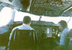 気さくなフライトアテンダントたちと話しているうちに、K2峰がもう直ぐ見えると教えてくれた。では、カメラを撮りに行って戻ってきたら、コックピットからK2がよく見えるからと中に入れてもらってこの写真を撮った。